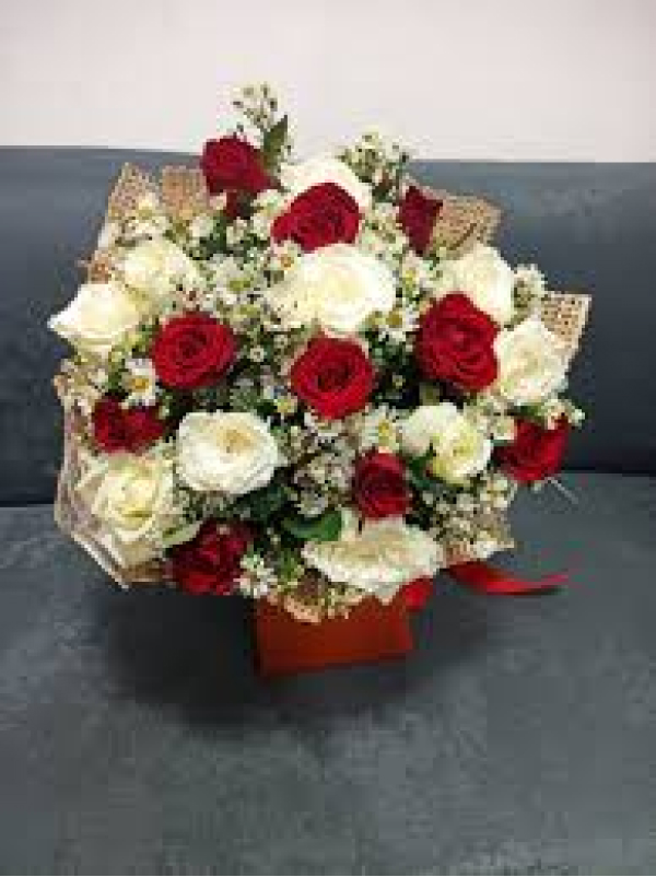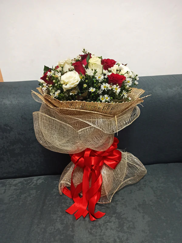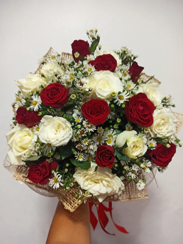 A timeless arrangement of fresh red and white roses, beautifully complemented by delicate white daisies. This bouquet is wrapped with rustic burlap for a charming touch and finished with a bold red ribbon. Perfect for expressing love, celebrating milestones, or gifting on special occasions.